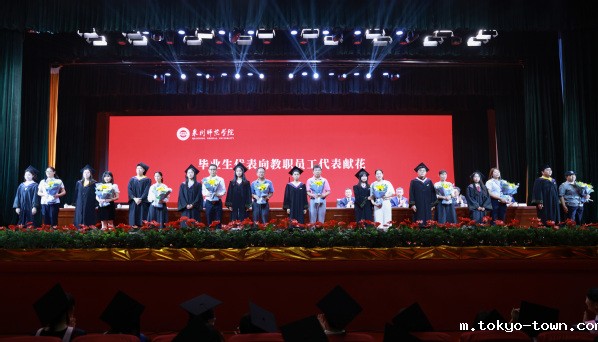 毕业生代表向教师、辅导员、宿管员、保安员、餐厅服务员等一线教职员工代表献花,感谢全体教职员工的辛勤付出。