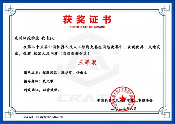 From August 20 to 21, the 25th China Robot & Artificial Intelligence Contest (CRAIC) National Finals were held in Mianyang, Sichuan Province. QNU students majoring in automotive service engineering from the School of Transportation and Navigation achieved third place in the national competition for the “Apollo Starfire Autonomous Driving Competition” in the Autonomous Driving Simulation category. This marks the inaugural participation of a team from QNU in this competition. (Team members: Zou Chenfenglin, Chen Hualiang, Ren Haojie & Instructor: Dai Wenpan).