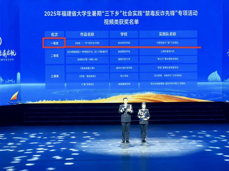 11月18日至21日,由福建省禁毒委员会办公室、福建省教育厅、福建省司法厅和共青团福建省委员会联合主办的全省高校禁毒志愿宣讲培训班暨首届大学生禁毒文化艺术节在福建理工大学、福州大学城艺术文化中心隆重举办。 活动期间,公布了2025年福建省大学生暑期“三下乡”社会实践“禁毒反诈先锋”专项活动结果,我院化工科技创新创业协会组建的守望青春不“毒”行实践队凭借扎实的实践成果与新颖的宣传形式脱颖而出,创作的视频作品《破毒一一“药”命的电子烟》荣获一等奖,撰写的调研报告《新型毒品隐蔽化传播背景下青少年禁毒教育路径优化研究》斩获二等奖。
