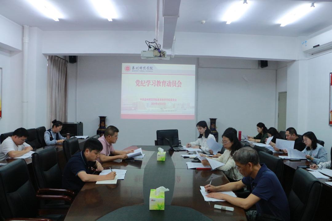 为深入学习贯彻习近平总书记关于党纪学习教育的重要讲话和重要指示批示精神,4月22日,学院党委召开党纪学习教育动员会。院党纪学习教育领导小组成员、院党建与思想政治工作领导小组成员、党委组织员、党支部书记、系(中心、室)负责人参加会议。会议由学院党委书记陈一祥主持。