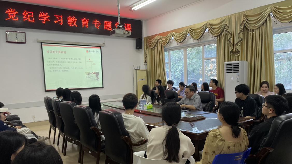为深入学习贯彻习近平总书记关于党的自我革命重要论述精神,扎实开展党纪学习教育,5月17日下午,学院党委书记胡凌松为毕业班学生党员、学生第二支部党员上题为《学纪 知纪 明纪 守纪》专题党课。