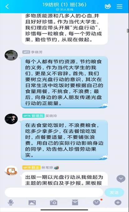 本次主题班团日活动,各团支部结合各自特色,紧密围绕“青春光盘行动,从我做起”的主题,采用丰富多彩的形式开展活动。19服工团支部通过学习古代先贤勤俭节约的故事,了解和对比中国式“剩”宴及贫困地区的粮食问题,帮助同学们牢固树立正确的文明餐饮观念。19服设团支部则通过观看粮食浪费的案例视频,参与有关粮食节约的知识竞答,增强同学们厉行节约、反对浪费的意识。