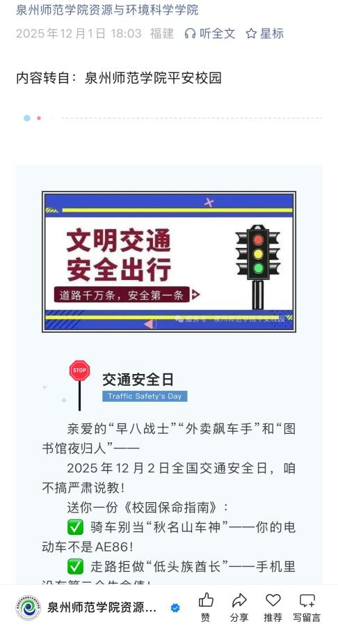 二、广拓线上宣传,筑牢安全意识。我院利用官方公众号“taptap点点体育登录资源与环境科学学院”发布了“文明交通安全出行”安全专题内容,图文并茂解析骑车、走路、坐车的危险行为与正确操作,营造了良好的交通安全教育氛围,增长全院师生的交通安全知识,提高其交通安全意识和自我防护能力。