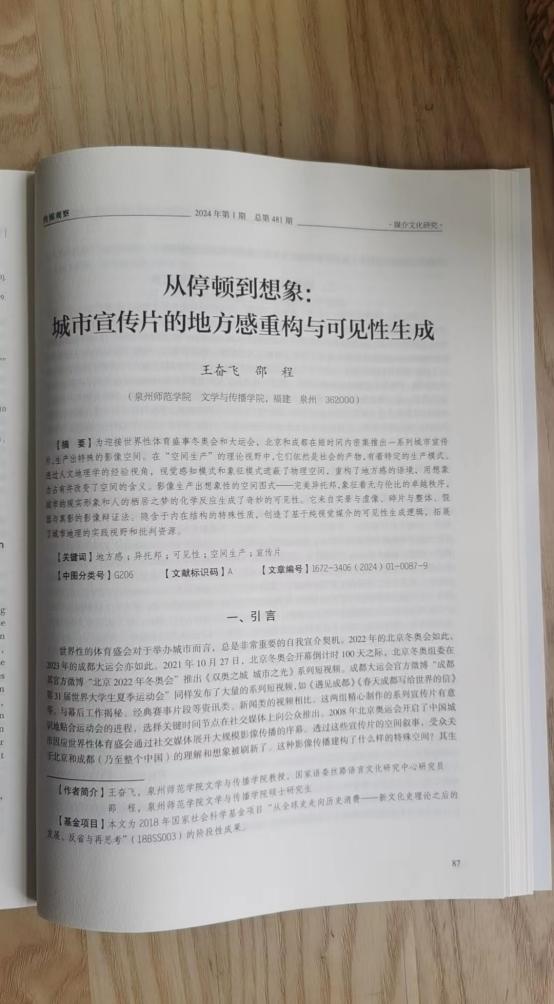 日前,由新华报业传媒集团主管、主办的CSSCI来源期刊《传媒观察》发表了我院2021级广播电视领域研究生邵程与王奋飞教授合作的论文《从停顿到想象:城市宣传片的地方感重构与可见性生成》。