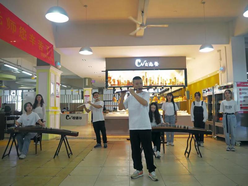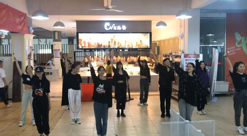 轻快的节奏、跳跃的身影吸引着正在用餐的师生、食堂工作人员们纷纷驻足观看。
