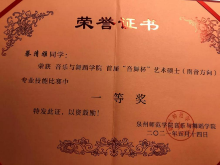 (4)2021年9月,主演的作品《刺桐遗梦》获福建省第六届大学生艺术节器乐专业组一等奖。