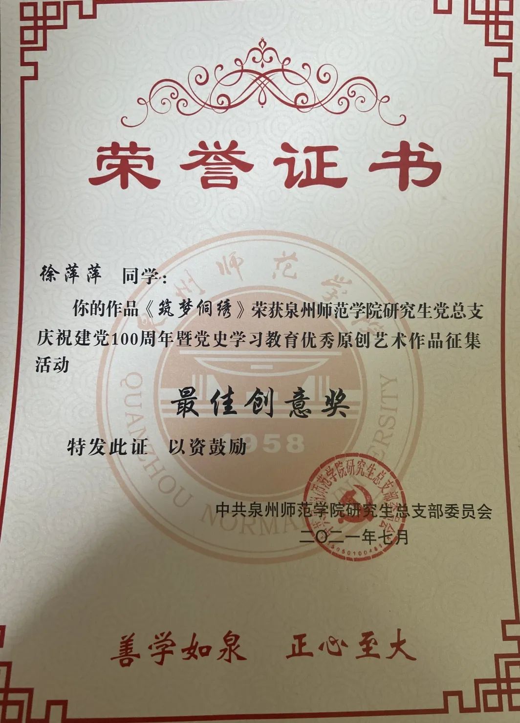 (9)2021年7月,获得taptap点点体育登录研究生党总支庆祝建党100周年暨党史学习教育优秀原创艺术作品征集活动“最佳创意奖”称号。